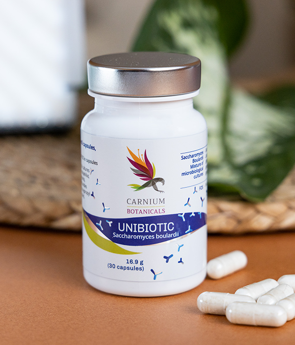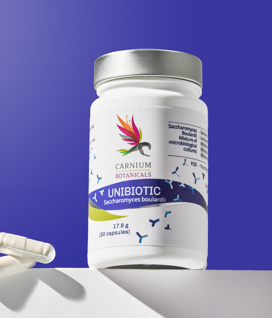 Το Unibiotic είναι ένα μοναδικό μείγμα μικροβιακών καλλιεργειών και φρουκτοολιγοσακχαριτών, που περιλαμβάνουν ολιγοσακχαρίτες και φυτική ινουλίνη. Οι κάψουλες είναι επικαλυμμένες με μια ειδική φυτική επίστρωση που διασφαλίζει ότι οι μικροβιακές καλλιέργειες επιβιώνουν από το οξύ του στομάχου. Το Unibiotic είναι ένα μείγμα 4 διαφορετικών προβιοτικών στελεχών που μαζί περιέχουν έως και 10 δισεκατομμύρια καλλιέργειες σε μία κάψουλα.
